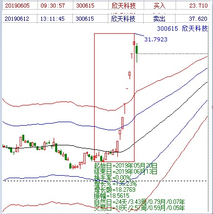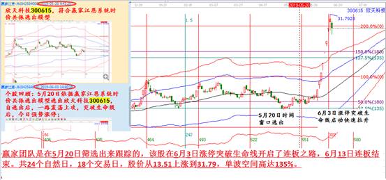 接下來介紹下近期的牛股欣天科技(300615),這是一個翻倍股,贏家團隊是在5月20日篩選出來跟蹤的,該股在6月3日漲停突破生命線開啟了連板之路,6月13日連板結束。共24個自然日,18個交易日,股價從13.51上漲到31.79,單波空間高達135%。