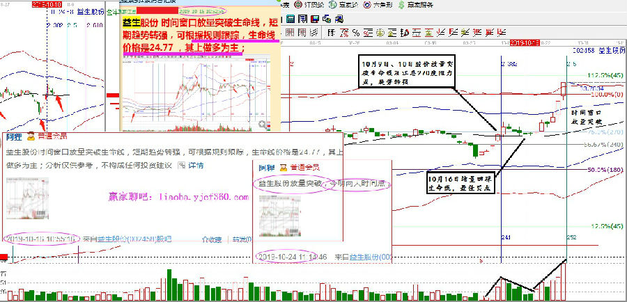 接下來,我們講下個(gè)股的實(shí)戰(zhàn)案例,這個(gè)股票就是益生股份,該股是在江恩時(shí)間窗口10月9日、10日放量突破站穩(wěn)江恩270度及極反通道生命線的,趨勢(shì)轉(zhuǎn)強(qiáng),符合跟蹤操作規(guī)則。因此在10月16日股價(jià)縮量回踩生命線時(shí)做了詳細(xì)的圖形展示,股價(jià)隨后啟動(dòng)拉升,并在10月25日時(shí)間窗口繼續(xù)加速封板,短短一周的時(shí)間已經(jīng)從最佳買點(diǎn)生命線上漲到階段減持點(diǎn)紅色線,單波利潤(rùn)達(dá)到35%;如此巨大的上漲空間皆是因時(shí)間周期的精確預(yù)判而獲得。可見,時(shí)間周期在個(gè)股分析交易中的巨大威力。