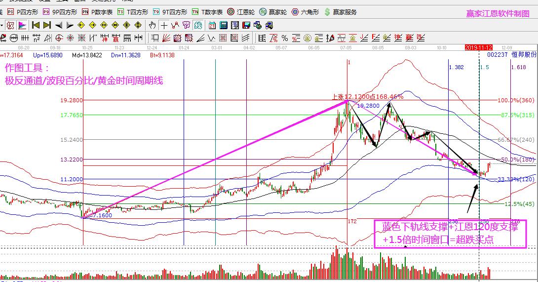 下圖是恒邦股份的超跌買點展示:股價調整到極反通道藍色下軌線,同時,江恩120度分割位支撐附近,疊加1.5倍時間窗口,短期共振向上,符合極反通道藍色下軌線超跌買點要求。短期從藍色下軌線反彈超10%,時間窗口11月12日為階段低點。按照規則買入,反彈目標就是生命線。