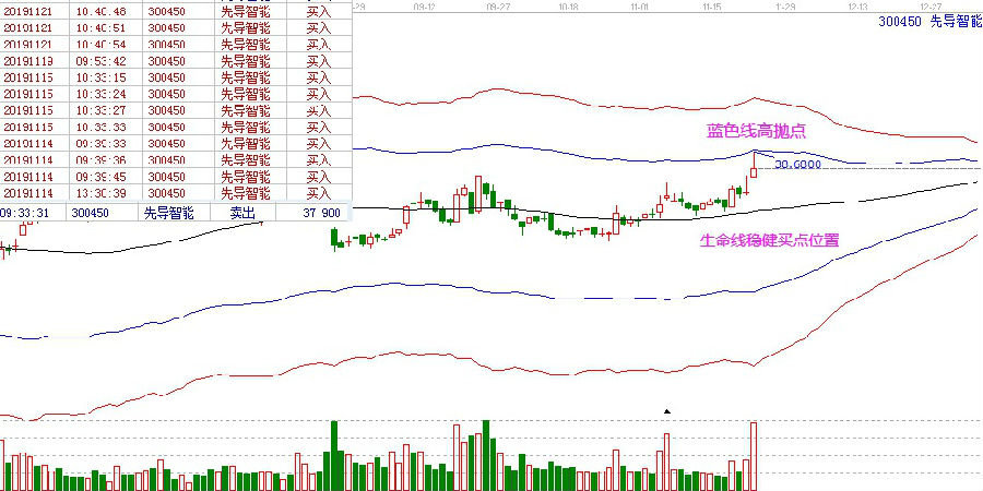 先導智能生命線啟動之后,11月22日攻擊到了目標點藍色線,這是我們生命線穩健買點的目標點,按照規則可以獲利賣出。下面是具體的走勢圖: