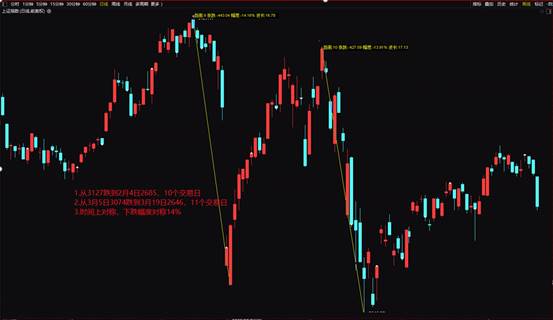 從3127跌到2月4日2685,共10個(gè)交易日,從3月5號(hào)3074跌到3月19日2646,11個(gè)交易日,兩者時(shí)間上差一天,空間上跌幅均是14%。