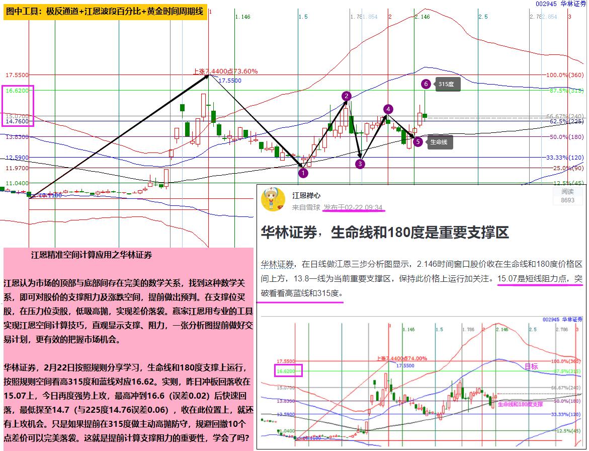 華林證券,2月22日按照規則分享學習,生命線和180度支撐上運行,按照規則空間看高315度和藍線對應16.62。實則,昨日沖板回落收在15.07上,今日再度強勢上攻,最高沖到16.6(誤差0.02)后快速回落,最低探至14.7(與225度14.76誤差0.06),收在此位置上,就還有上攻機會。只是如果提前在315度做主動高拋防守,規避回撤10個點差價可以完美落袋。這就是提前計算支撐阻力的重要性,學會了嗎?