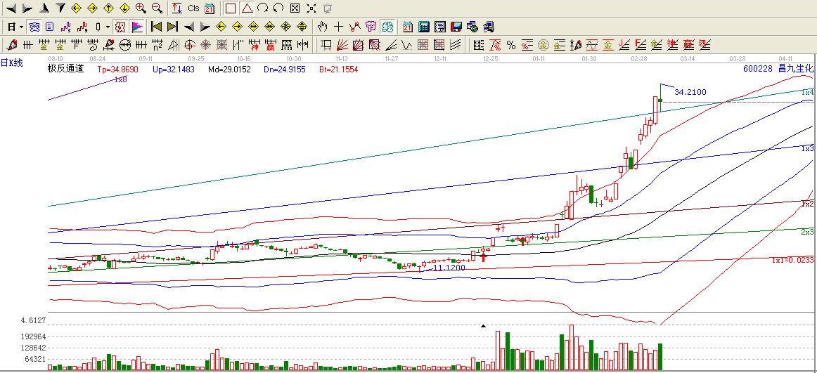 600228昌九生化在角度線1*1線位置2012-12-14日11.12止跌上行,連續的小陽線線 直到到2012-12-19日漲停極反通道上行才開始了黑馬之旅,底部構成也可以算是10全10美。只有一跟小陰線,可以忽略不計。 一旦突破極反通道生命線,特別是漲停方式突破極反通道生命線,那就是短期進入了強勢區域,贏家極反通道可以告訴我們:生命線上強勢走,生命線下難抬頭,牛股都是在生命線上方運行的。每一次的運動后期都是按照角度線運行的,每一次的高點低點加倉位置都逃脫不了角度線的區域。