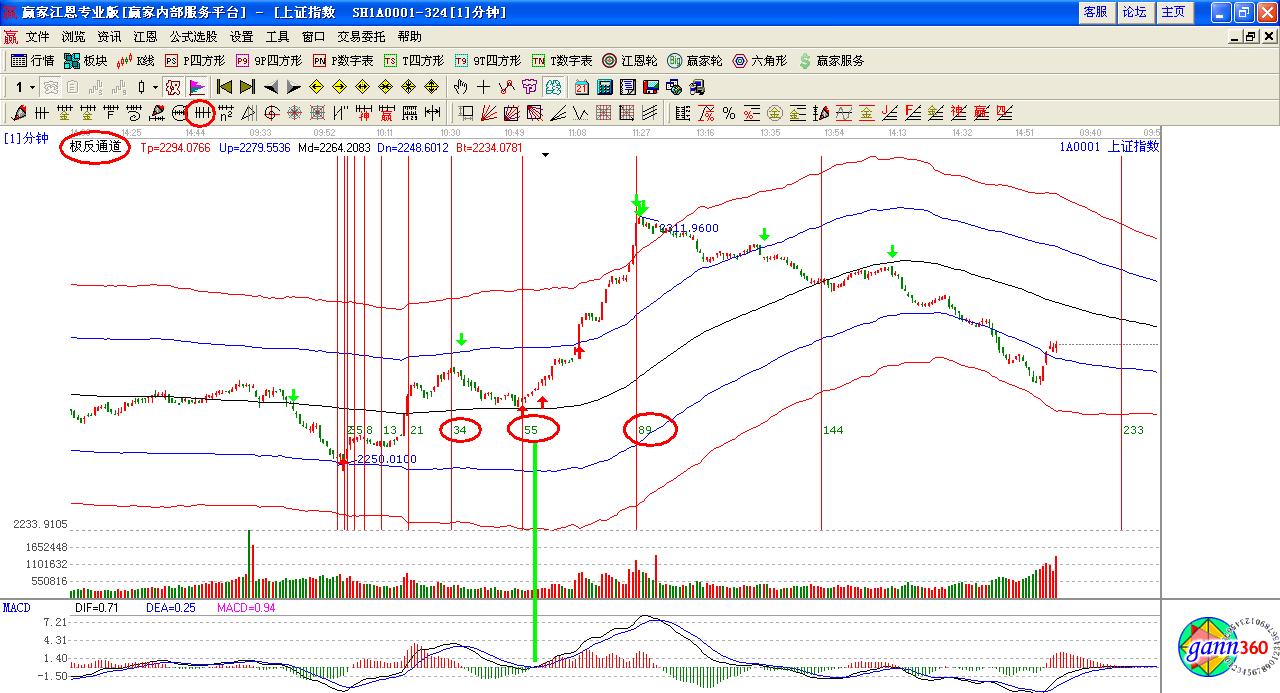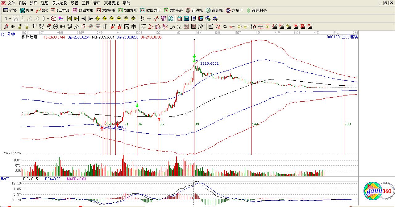 股指期貨在2013-03-15日9.55分見底2504.00遇到極反通道下軌位置,按照江恩規則上一次2013-14日09.15分低點2505.2點附近是一個絕佳的買點。這個買點也符合贏家極反通道的絕佳位置買點介入之后就開起了一波5分鐘的連續拉升,剛好是5時間周期,回調到8沒有止跌信號,在13時間窗口震蕩盤整后開啟了一波快速上行直接過21時間更為神奇的是股指期貨在22時間調整稍作休息后再一次創出新高這里距離34時間很近,而指標macd給出背離的信號賣出按照江恩法則,一波快速上行后在新高力度時間將發生轉折。在其34時間快速殺跌殺跌到55時間窗口,這里1分鐘指標再一次底背離發出買的信號,時間也到,極反通道生命線也到,前期的時間高低點超級符合,這樣就預示著一波大的行情即將來臨,隨之的是指標macd在0軸金叉也更充分的說明了這一點。連續的陽線也更加肯定了這個推斷,直接看下一個時間89時間,這里距離上午收盤時間也是極反通道紅色外軌道線的壓力量能出現3次背離,預示著行情的一個反轉隨之而來的就是一波緩慢下跌行情。而這些完全可以用江恩理論去解釋這一切,如果不明白就把江恩華爾街45年多看2遍。那么你就會知道為什么2504.00附近是一個很安全的買點了