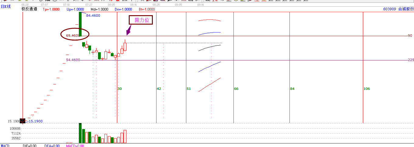 3.江恩工具分析共振:在603909的帖子和群消息中,我們講的很清楚。時(shí)間上,螺旋歷法時(shí)間循環(huán)線與輪中輪變盤(pán)點(diǎn)兩個(gè)不同的工具,在9號(hào)都出現(xiàn)了時(shí)間窗,形成了時(shí)間的共振。在價(jià)格上,處于K線價(jià)格四方形的支撐位。在選擇的時(shí)候,個(gè)股也處于極反通道生命線的上方。因此9號(hào)的時(shí)候在帖子里講,時(shí)間共振+價(jià)格支撐+極反通道生命線。這么多的共振了,還需要多說(shuō)什么,一個(gè)字——買。