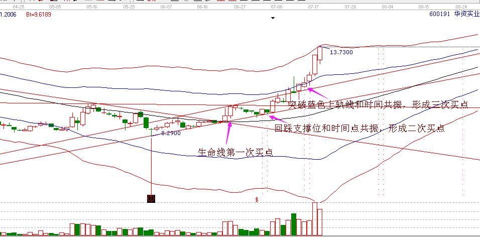 在上面的圖形中,個股在拉升過程中,有幾次的調整,我們可以看到在第一次從生命線開始上漲時,個股壓力位調整,回踩支撐位附近和輪中輪變盤點的時間窗共振,時間和支撐位共振形成二次買點。然后再次開啟拉升,一路向上突破極反通道藍色上軌線位置,再次和輪中輪變盤點的時間窗共振,形成了三次買點。按照極反通道操作規則,站穩一線看高一線,生命線啟動,第一目標位就是藍色上軌線位置,突破藍色上軌線,第二目標位就是紅色上軌線位置。按照這樣的分析,步步為營,不好高騖遠,只要趨勢不變就可以持續持股,因此咱們贏家才能安心的持股華資實業至當下。
