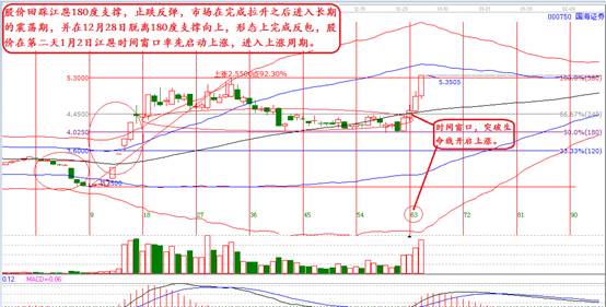 國海證券股價回踩江恩180度支撐之后止跌反彈,股價在完成拉升第一波之后進入長期的橫盤震蕩期,并在12月28日脫離180度支撐向上,形態上完成反包,股價在第二天1月2日江恩時間窗口率先啟動上漲,進入上漲周期。