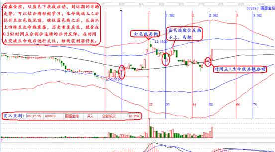 國盛金控,從藍色下軌線啟動,到近期的市場走勢,可以結合圖形做學習,生命線站上之后拉升至紅色線見頂,破位藍色線之后,反抽不上回踩至生命線震蕩,歷史重復發生,股價在0.382時間點分割位連續的拉升反彈,在時間點突破生命線后進行關注,短線獲利漲停板。