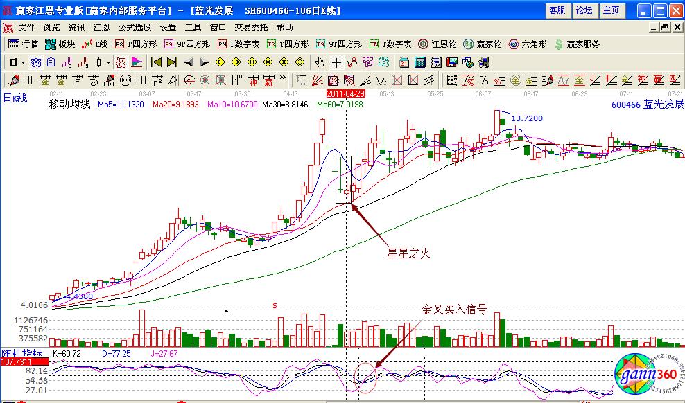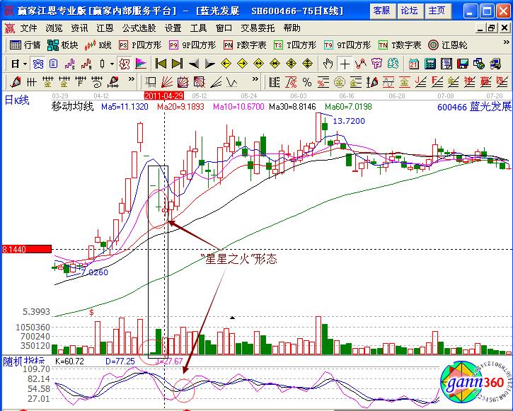 咨詢:13333833889無論是在下跌的走勢行情中還是上漲的走勢變化中,十字星可以說都是變盤的信號,特別是用股票行情軟件在大跌行情中分析的“星星之火”形態(tài),就是意味著股價筑底已經(jīng)完成,是反彈上漲的征兆。接下來我們就通過藍光發(fā)展的實例進行分析。