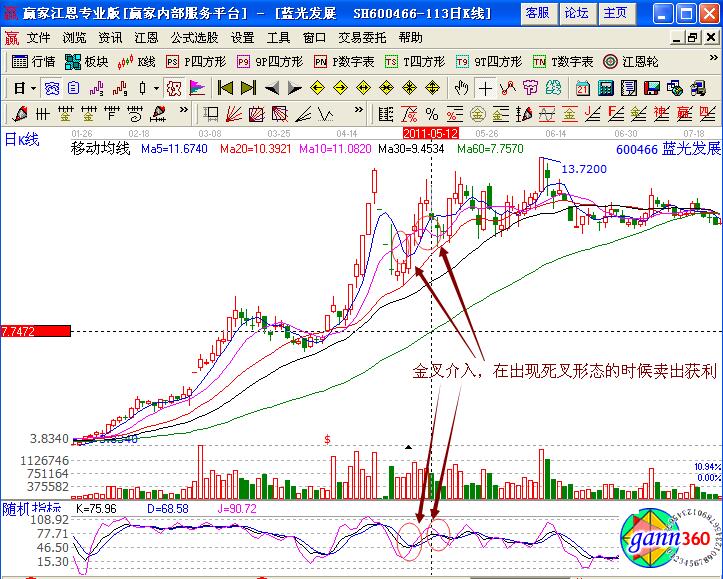 從圖中可以看出,在5月3日的時候,5日均線和10日均線形成的是金叉買入的信號,而且股價以20日均線作為上漲的支撐線,在結(jié)合kdj指標中形成的金叉買入信號,是一個很好的短線買入信號,投資者可以在該位置介入操作。