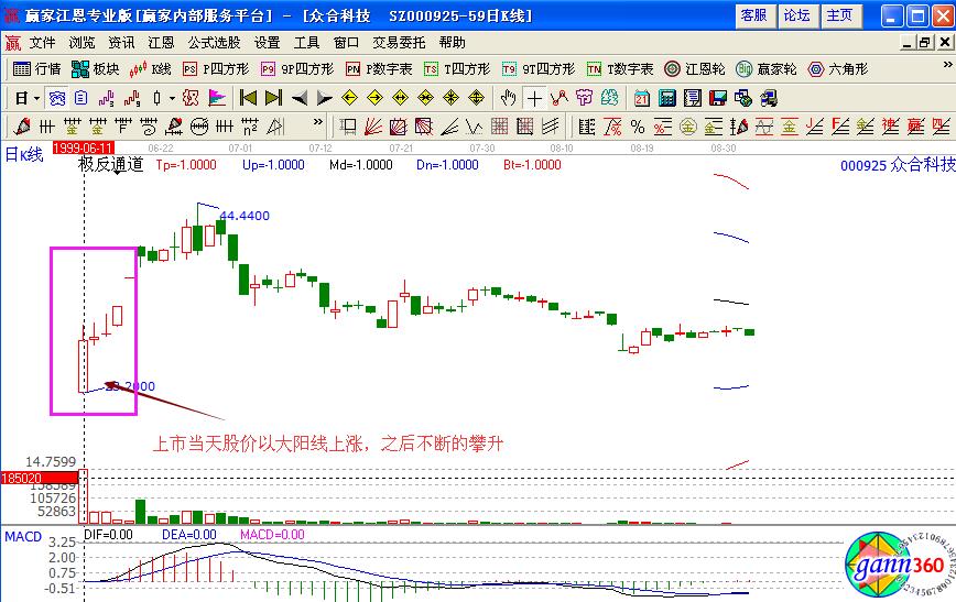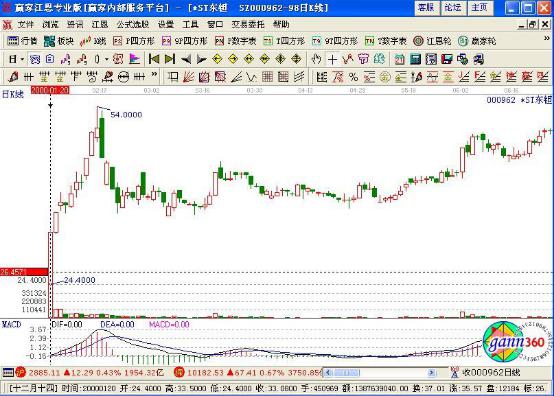 如下圖案例*ST東鉭(000962)在2000年1月20日上市,開盤價24.4元便成為最低價,當(dāng)日強(qiáng)勢上攻,以幾乎最高價33.08元報收,成交4500萬股,約占流通盤6500萬股的70%,明顯屬于主力資金的拉高建倉行為,第二天低開高走,以光頭的陽線報收。至此,可基本確定為一頭短線瘋牛,投資者即可及時跟進(jìn),其后短短數(shù)天升幅高達(dá)50%。