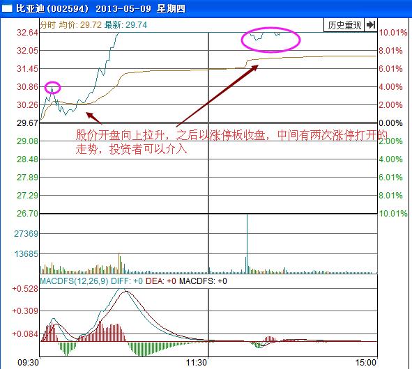 同時在第四根漲停的位置結合分時圖進行分析,可以看出該股在5月9日的分時圖開盤股價就向上不斷的拉升,之后以漲停板收盤,但是中間漲停板打開了兩次,說明主力意見不一,投資者可以趁此機會,介入漲停板獲得一部分的盈利。