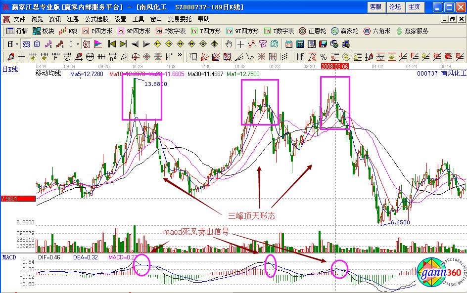 如圖南風(fēng)化工(000737)在2007年10月到2008年2月初的股價走勢形態(tài),形成了三次不同的頂部形態(tài),也就是所謂的“三峰頂部”,預(yù)示著賣出的操作信號,高點(diǎn)位置,對應(yīng)的量能放大,而且macd指標(biāo)也給出的死叉的賣出信號,都是一個比較好的賣出點(diǎn)位置。