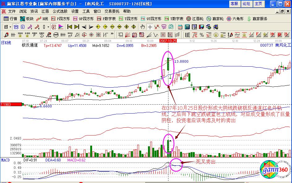 進(jìn)行細(xì)致的分析,觀察該股在07年10月25日的股價走勢,前期股價經(jīng)過上漲拉升,進(jìn)入強(qiáng)勢區(qū)域運(yùn)行,最后在25日形成了一根大陰線向下跌破了極反通道紅色外軌線,第二天向下跳空跌破藍(lán)色上軌線,成交量形成巨型陰量柱,是一個賣出的操作信號,投資者應(yīng)該及時賣出獲利。