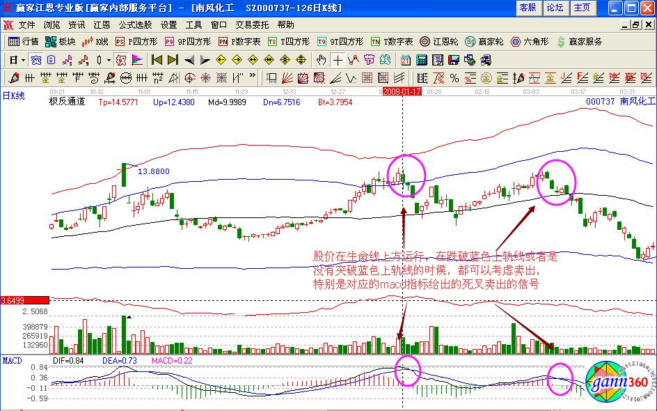 同理觀察該股在2008年1月12日和3月6日形成的階段性頂部,可以看出第二峰和第三峰的股價均低于第一峰,而且股價逐漸下跌的走勢,所以在圖中,股價運(yùn)行沒有突破藍(lán)色上軌線的位置,在結(jié)合macd的死叉賣出信號,應(yīng)該及時的進(jìn)行賣出獲利操作,以規(guī)避后市的下跌損失,而且依據(jù)三峰頂天的使用原則,可以明確,第三峰是最后逃命獲利的信號,投資者要及時的把握操作機(jī)會。