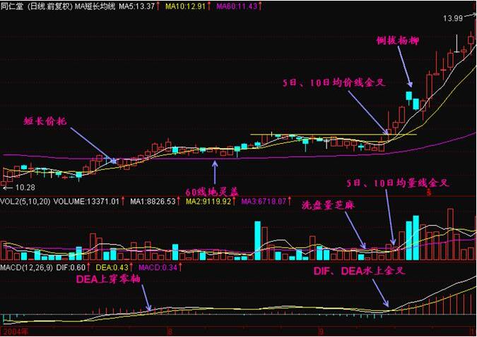 如圖同仁堂在2004年8月到9月的日K線股價走勢,經過長達一個月的橫盤走勢,股價出現了短長價托的走勢形態,在向上突破的時候,5日均線與10日均線形成了金叉走勢,同時對應的均量線也形成了金叉形態,但是量能卻是很小的洗盤量芝麻,結合macd指標進行分析,dea向上上穿0軸,兩線在0軸上方形成了水上金叉的形態,此時形成了三金叉見底的走勢形態,投資者可以在形成進行的位置進行買入操作,等待后市的上漲變化。