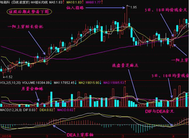 與此對比的,觀察哈高科在2005年1月到4月的股價走勢變化,股價K線在走勢變化中,形成的有一陽上穿短長價托,與仙人指路的K線組合形態,在下跌回調的走勢中,形成的是三金叉見底的形態,同時形成了一陽穿多線的的走勢形態,預示著上漲的操作行情,此時投資者可以積極的介入等待上漲獲利。