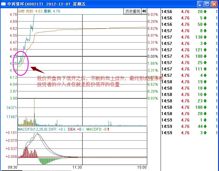 依據(jù)倒拔垂楊柳的應(yīng)用技巧,對(duì)比在分時(shí)圖中的走勢(shì)進(jìn)行分析,可以看出在股價(jià)低開的時(shí)候是最佳的介入點(diǎn)位置,在2012年12月7日股價(jià)低開高走,不斷的向上拉升,在10點(diǎn)半之前就形成了漲停板的走勢(shì),其中投資者的介入位置就是股價(jià)低開的位置,希望投資者積極的把握實(shí)戰(zhàn)中的操作機(jī)會(huì)。