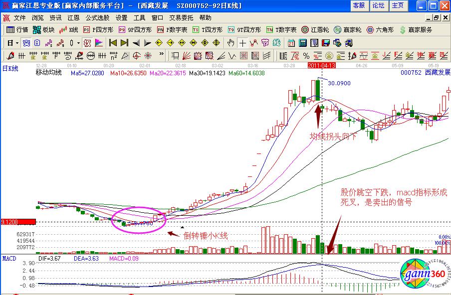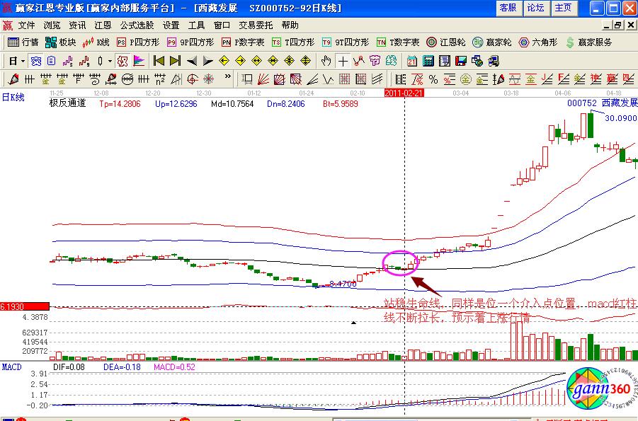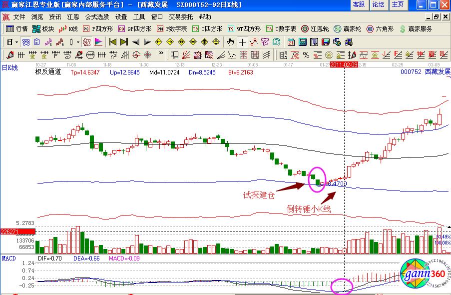 個股的走勢形態是通過案例進行分析的,同樣的倒轉錘小K線也是同樣的道理,如圖西藏發展(000752)在2011年2月初的股價走勢,是在極反通道藍色下軌線的位置,獲得支撐是一個試探性介入的點位,之后股價形成了連續向上拉升的幾個小陽線,同時形成的是倒轉錘小K線具有一定長度的上影線,其量能的走勢比較平緩,次日股價向上拉升形成漲停板,是投資者要捕捉的漲停板走勢形態,同時macd指標形成了金叉買入的操作信號,可以積極的進行買入操作,但是生命線下方是弱勢區域,倉位不要過重。