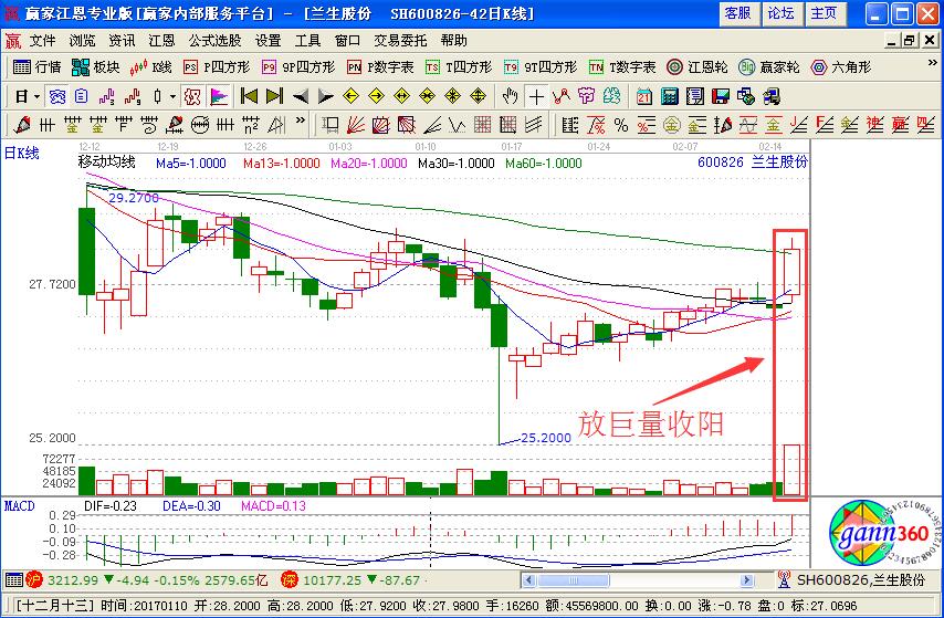 1.標準下降通道,突然爆發性放量拉高。這類股票大多有漂亮的下降通道,突然在某天放巨量收陽線(上圖所示),由此底部形成。