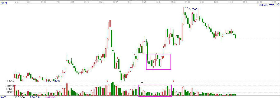 這里還有一點需要我們注意,如果一支股票股價下跌的幅度越來越小,或者是直接出現(xiàn)跳空下跌的缺口,成家量也伴隨著大幅的縮小,然后又出現(xiàn)放量股價拉升的情況,那就是市場見底的表現(xiàn)。其實在成交量見底的時候,也代表著投資者對于該股票的期待情緒降到最低的時候,在下跌的過程中,賺錢該走的都走了,虧損的也套死不愿意動了,市場的交易已經(jīng)變的很清淡,按照中國易經(jīng)里講的,物極必反:全則必缺、極則必反,下跌至一定的程度之后,必定要向相反的方向運行,底部形成,就是放心大膽的買進,然后耐心等待市場反轉(zhuǎn)拉升。