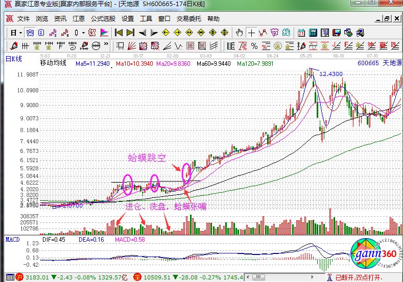 從上面的內容,我們就可以得到,當金蛤蟆右爪與60日均線接近部位的時候大膽買入,特別是出現量芝麻點的時候更應該買入。當股價沖過金蛤蟆眼睛的瞬間介入,此時整段漲勢已經確認,只是價位稍微高一點。