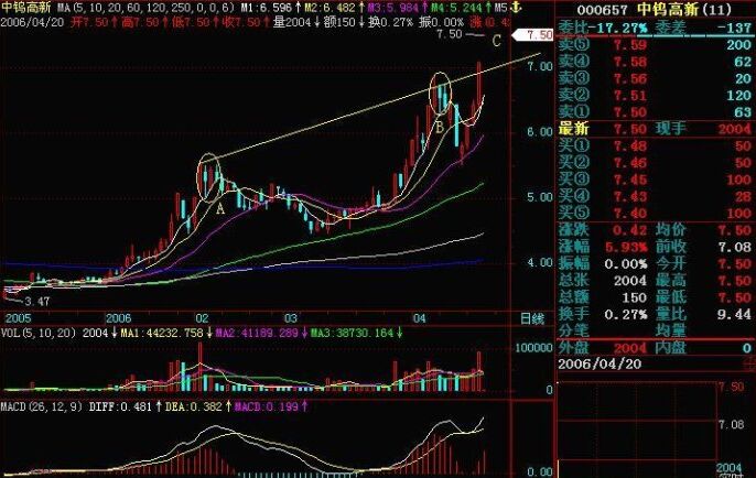 圖中的A、B兩點畫出個圓,那么我們就可以得到了一對蛤蟆眼是炯炯有神,60日與120日平均線就是蛤蟆張嘴,這是一種標準的莊股形態,即金蛤蟆形態。圖中的AB線就是蛤蟆眼線,圖中前一天K吸納沖高該線,就是一種非常好的買入信號。