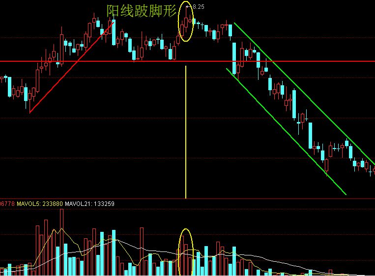 上面的這一張圖形中,股價處于相對高位,出現量價背離的“陽線跛腳形”組合之后,股價見頂回落!之后該股更是跌破頸線走出了下降通道,顯然該形態的出現是有一種見頂的含義的。除了上面的這種情況之外,還有就是股價在連續上漲之后出現這個圖形,隨后股價快速回調的走勢,如下圖所示。