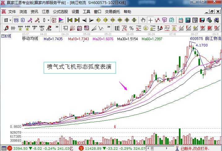 上圖就是皖江物流的歷史走勢圖,圖中的該股是一直是處于緩慢爬行的階段,漲幅雖然不大,但是該股的五條均線呈現處了多頭排列的走勢,顯然是符合上面所講的噴氣式飛機形態的弧度表演。