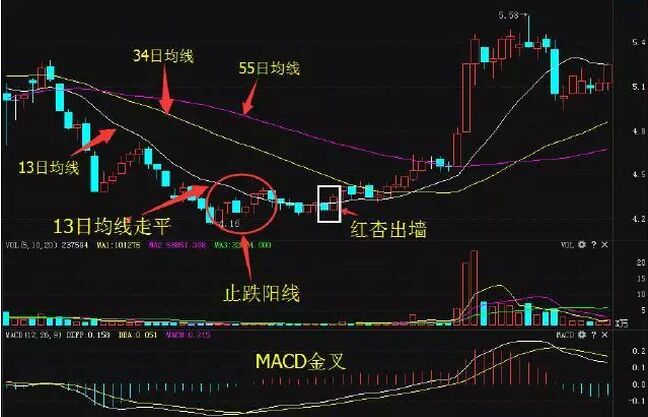 13日均線由下降趨于走平,股價從下向上突破13日均線,并且在13日均線上企穩,這根站在13日均線的陽線稱為是紅杏出墻,紅杏出墻是第一買點,也是行情最初啟動點。如下圖所示。