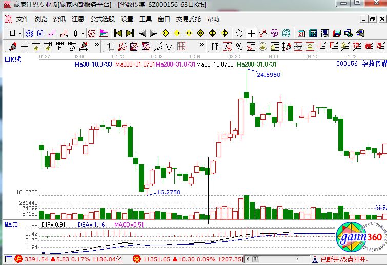 華數(shù)傳媒在2016年3月18日走出了第一根大陽線,成交來個能呈現(xiàn)倍量走勢,符合了堆量戰(zhàn)法的必備條件,之后股價線上跳空形成小碎陽的上漲形態(tài),在3月23日向下低開,此時就是很好的買入點位置。賣點的位置大家就可以參考上面的賣點依據(jù)進行賣出,當然可以依靠極反通道指標來進行判斷。