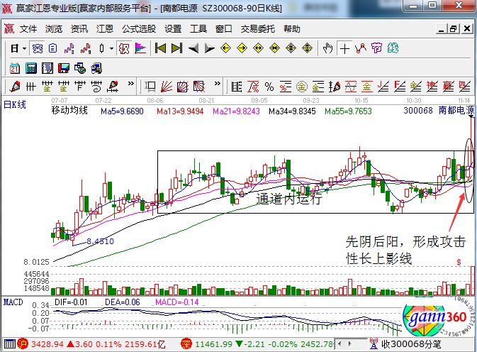 上圖是南都電源在2014年7月至11月份的走勢圖,圖中我們可以看到股價的在波段式的上升趨勢中出現一個盤整通道,同時在盤整走勢的出現了前一個先陰后陽的走勢,同時陰線呈現的縮量銀珠,第二天放量收復了陰線的下跌,當天留下了長長的上影線,顯然是符合這個買入方法的條件。所以投資者就可以在分時均線上附近買入如下圖所示。
