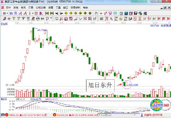 上圖是光華科技在2016年1月份的走勢圖,圖中我們可以看到該股在1月28日和29日形成了典型的旭日東升信號,我們在觀察該形態的話,它是在經過了大幅度的連續下跌之后,在底部出現的,在出現該形態之后,股價開始進行上漲,顯然是一種非常符合標準的見底回升形態。
