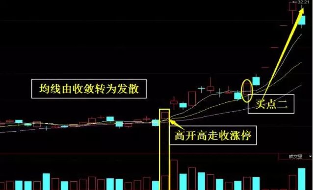 出現(xiàn)在中長期上升趨勢的初期,或長期上升趨勢大的中期調(diào)整行情末期。5日、10日和20日均線由逐漸收斂、粘合轉(zhuǎn)為緩慢發(fā)散。日K線上以小陽線、小陰線穩(wěn)步緩慢攀升,其中小陽線居多。股價或指數(shù)跳空高開,放量收出大陽線或中陽線,越過所有周期均線,并突破其他技術(shù)形態(tài)上的關(guān)鍵位置。