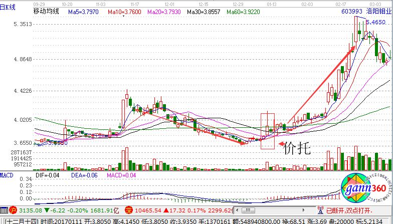 在這之后,K線開始反彈回轉,均線當然也出現了拐頭的走勢,同時5日均線開始長虹攢10日均線,形成金叉,之后5日均線再上穿20日均線,形成金叉,最后是10日均線上穿20日均線,就形成了一個三角形,一般三角形支撐著上方的中陽線或大陽線,同時常常伴隨著成交量的放量,這其實就是平衡藏我們所說的價托。