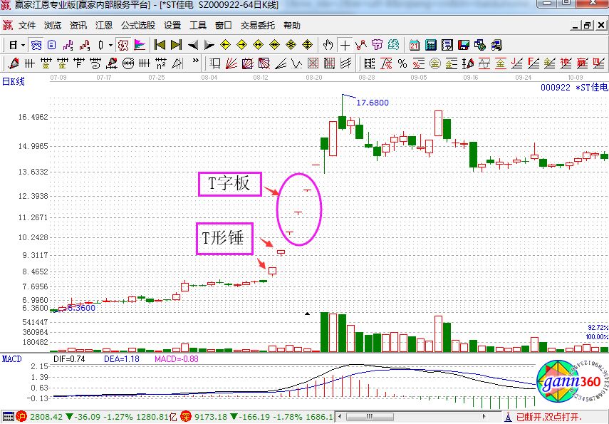 上圖是*ST佳電股份在2014年7月至10月的走勢,股價在前一個平臺做短暫調整后,以T形錘、T字板的方式直線拉升七個漲停板。股價也從平臺其的不足8元到高出的15元以上,走出了翻倍的行情,而且所用的時間不足10天。
