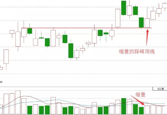 2、 最后一根縮量陰線回踩回探重要的防線,或者說是支撐線,比如是黃金線、峰頂線等等。