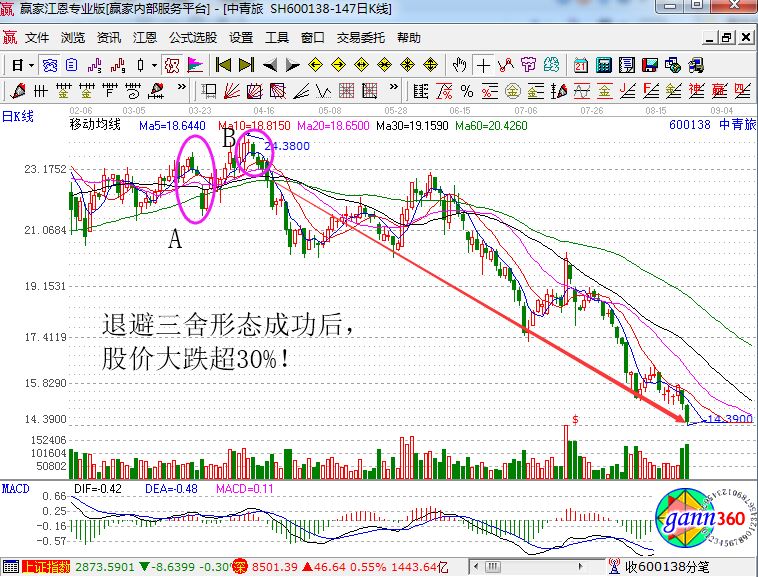 如上圖所示,這是中青旅近期的走勢圖,從圖中可以看到,在今年的3月中旬,股價已經(jīng)運行至階段性高位區(qū),根據(jù)圖中的A區(qū)和B區(qū)所示,股價出現(xiàn)了兩次“退避三舍”形態(tài),其中A區(qū)形態(tài)失敗,B去形態(tài)成功。