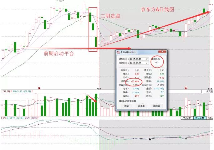 然而,該股在第四個交易日收出了一根小陽線,這個位置也是非常接近前期啟動平臺的,往往是有比較強的支撐作用,果然,股價在這里有止跌企穩的跡象,隨后,震蕩上行,創出新高,在短短的38個交易日里,股價大漲27.4%,重新回到了前面的高點位置。