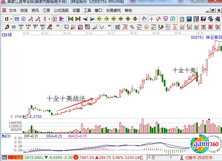 這是鋅業股份000751在2015年2月份至5月份的走勢圖,從圖中可以看到:該股從當年的2月9日開始小陽線拉升,拉個8根小陽線后小陰小陽線繼續向上,一只都是按照一定的傾斜度向上,到了3月23日小幅的盤整之后,開始一波幾十點的上揚。到了2015年5月19日開始有連續拉出八根陽線,調整后又一波大幅上漲。