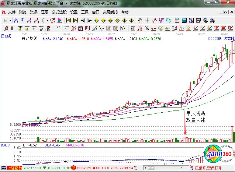 通過達意隆的實戰走勢分析,我們來總結一下旱地拔蔥形態的技術要點,具體如下: