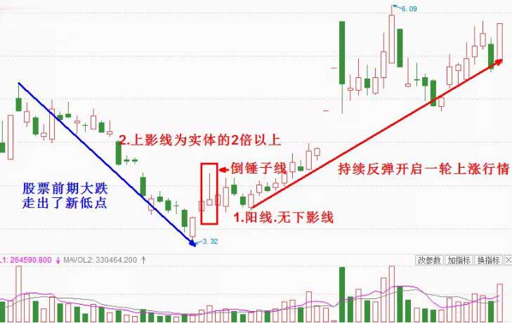 1、 前期股價回落持續創新低,下跌見底后出現倒錘子線。