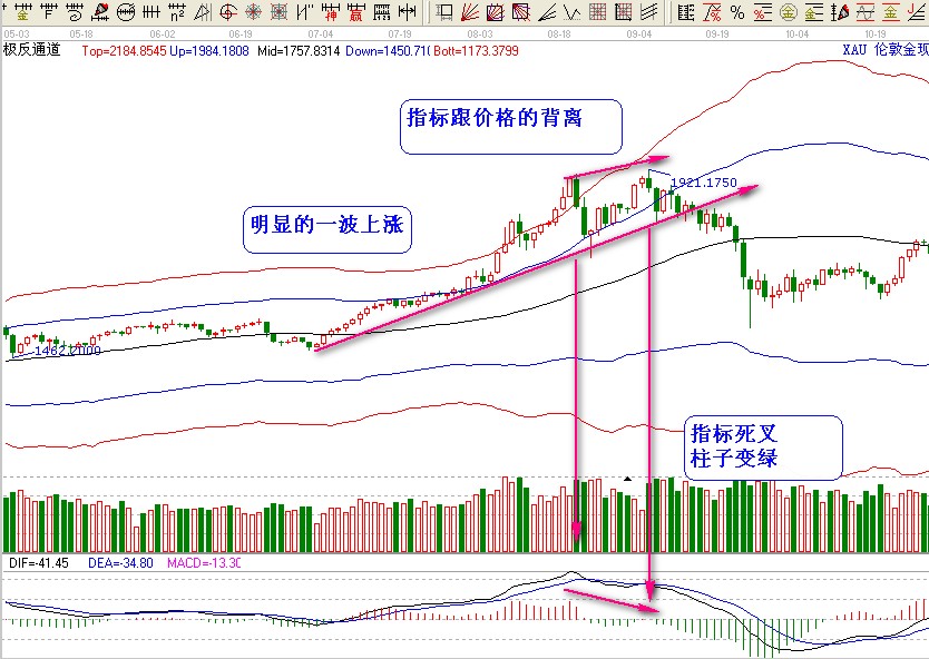 看下面的圖可以看出;指標背離 死叉賣出,細節問題就是 必須有一段原有的上升趨勢。破了趨勢線也就是破了極反通道上軌的位置,最佳賣出位置,沒有賣到最佳的點位,但是吃到了最安全最大的利率。