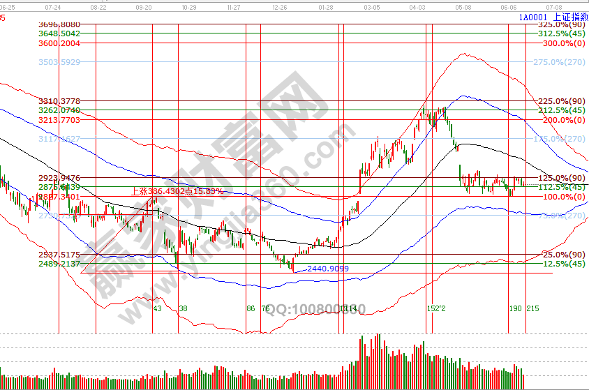 指數(shù)連續(xù)兩個(gè)交易日收盤在贏家江恩系統(tǒng)工具分析的關(guān)鍵區(qū)2880-2890之間,周一盤中擊破2880后收復(fù),此區(qū)間是江恩價(jià)格圖表四方形和60分鐘極反通道生命線,運(yùn)用多周期結(jié)合判斷,關(guān)鍵位不破保持市場延續(xù)反彈的觀點(diǎn)。如受外因不確性因素影響,波段百分比延伸線2834點(diǎn)是強(qiáng)支撐,該位置是近1個(gè)多月來箱體震蕩平臺(tái)下沿,重要性不言而喻。反彈第一目標(biāo)位2950位置,第二目標(biāo)位是日線黑色生命線,在可承受的風(fēng)險(xiǎn)持倉內(nèi)保持平和的心態(tài)應(yīng)對(duì)市場。6月18號(hào)盤中壓力是135度2911點(diǎn)、180度2928點(diǎn),盤中支撐是0度2860、315度2844點(diǎn)。操作策略,指數(shù)處于極反通道弱勢(shì)區(qū)域的反彈走勢(shì),繼續(xù)關(guān)注2880-2890區(qū)間得失,整體持倉保持3-5成。