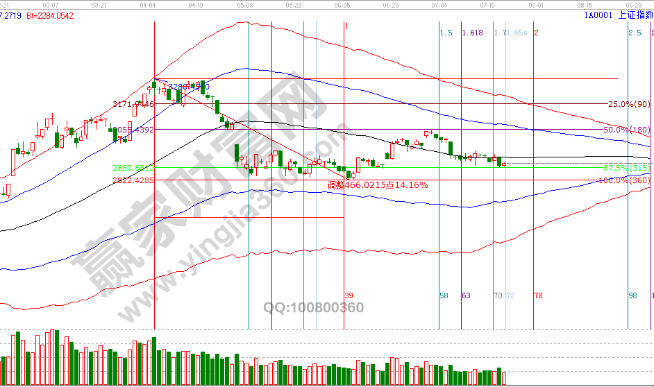 23(24)號是贏家江恩時間工具測算本月最后一個時間時間窗口,8號中陰后橫肋第12天,按費(fèi)氏時間線做圖25號是第13天,這是短線時間極限窗,進(jìn)入方向博弈決戰(zhàn)期。趨勢方向,三大指數(shù)深指、創(chuàng)業(yè)板在日線極反通道生命線上運(yùn)行,滬指線下弱勢區(qū)運(yùn)行,深市保持強(qiáng)勢運(yùn)行還有機(jī)會帶動滬指轉(zhuǎn)好,深市失守則確認(rèn)日線趨勢轉(zhuǎn)弱。價格關(guān)鍵位上,滬指擊破波段百分比延伸線240度2878點(diǎn),或收復(fù)日線生命線2926點(diǎn)會有操作,這兩天要多盯盤做好應(yīng)對。7月24號盤中壓力是135度2911點(diǎn)、180度2928點(diǎn),盤中支撐是0度2860點(diǎn)、315度2844點(diǎn)。操作策略,指數(shù)極反通道生命線下弱勢震蕩,整體持倉保持3成以內(nèi),用規(guī)則紀(jì)律應(yīng)對盤面方向選擇。