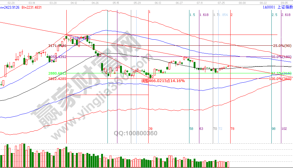 從江恩時間周期角度分析,市場又到了一個日線方向選擇區(qū),回顧近幾個月指數時間窗口(3月7號、4月8號、5月17號、6月5號、27號、7月3、15、23號),市場的重要級別、次要級別的時間拐點都是提前做出測算并公布,今天收盤后贏家江恩技術團隊將借助工具分享8月時間窗口,目前公布的第一個是1號(黃金時間周期0.618);價格方面,江恩價格百分比延伸線2倍零度位2966點與240度2878點,是自8號后強調的具有操作條件的兩個位置,15、23號分別觸及2878點后回升,昨天是上攻至2966點(最高2965相差一個點)回落,結合趨勢,時間、價格三者綜合判斷,本周后半周持有倉的投資者要關注好盤面動向,并做好應對計劃策略,7月31號盤中壓力是270度2961點、315度2978點,盤中支撐是180度2928點、225度2944點。操作策略,指數極反通道生命線震蕩,指數失守60分鐘生命線則反彈信號結束,向上則關注60分鐘藍色上軌線也有望形成反彈結束信號,投資者保持3成。
