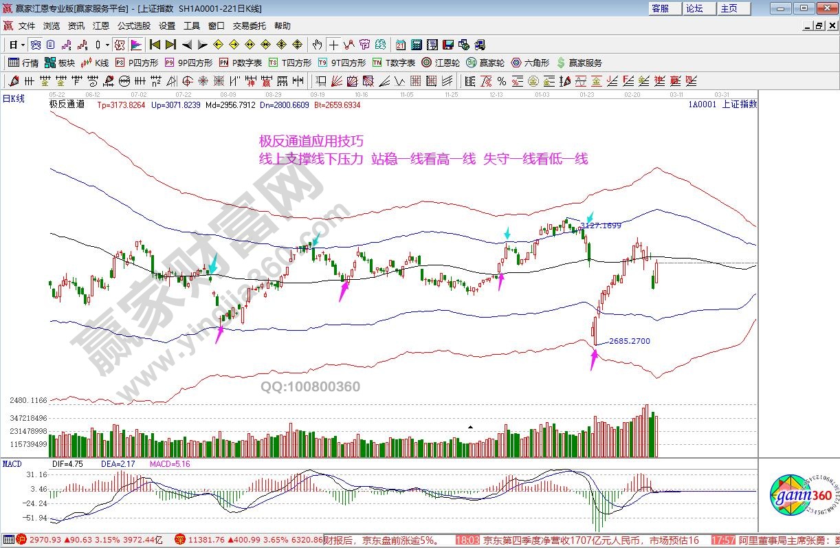 ★依據(jù)贏家江恩系統(tǒng)自由時(shí)間價(jià)格計(jì)算器(江恩箱)分析:指數(shù)收盤正好在上升3*2線2970一點(diǎn)不差,按規(guī)則短期看多。