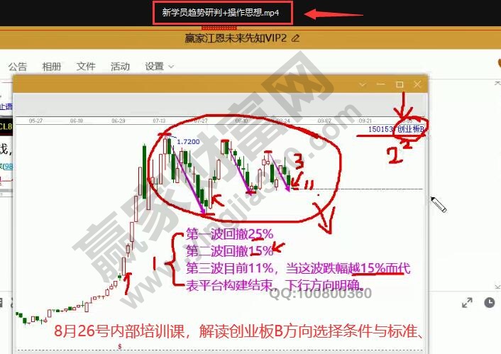 如圖3,8月26號正式學員內(nèi)部培訓課繼續(xù)講解創(chuàng)業(yè)板B、創(chuàng)業(yè)板、滬指的分析方法及判斷條件與方向。