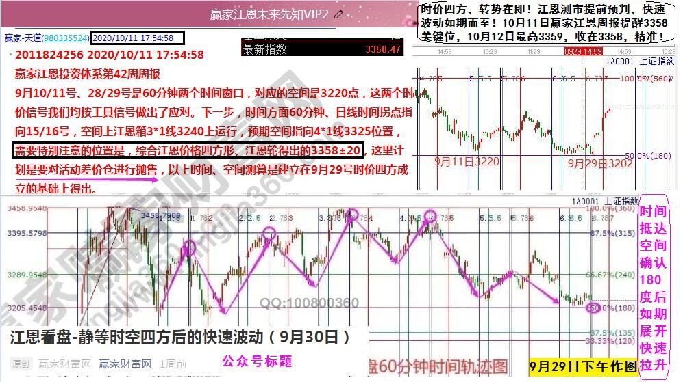 江恩理論,作為金融市場的高端技術體系,其尤為注重對市場時間和價格的研究分析,借助專業的數學模型有效的找到歷史走勢中所蘊含的時價因子,從而提前推演未來,找到市場的時價四方拐點,精準把握趨勢及波動利潤。回顧節前預測分析,9月29日時間窗口到達,空間上再探3220±20一線,時空相遇形成四方,轉勢迫在眉睫。公眾號yingjiajiangen江恩看盤標題直接強調“靜等時空四方后的快速波動”,注意關鍵詞“快速波動”。實則,對照60分鐘的時價分析圖,時間抵達空間確認180度關鍵位形成四方點;11日高開高走,12日繼續高開高走,強勢收在3358點。此點位在11日周報預期中特別強調,完美抵達,29日前后低吸的倉位收獲滿滿。(預判市場快速波動的條件是什么?上周六VIP內部培訓課有詳細講解)