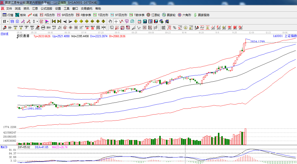★依據贏家江恩系統極反通道提示:超強外軌線之外,強勢震蕩,十字星報收,適當控制倉位,注意短線回調風險。